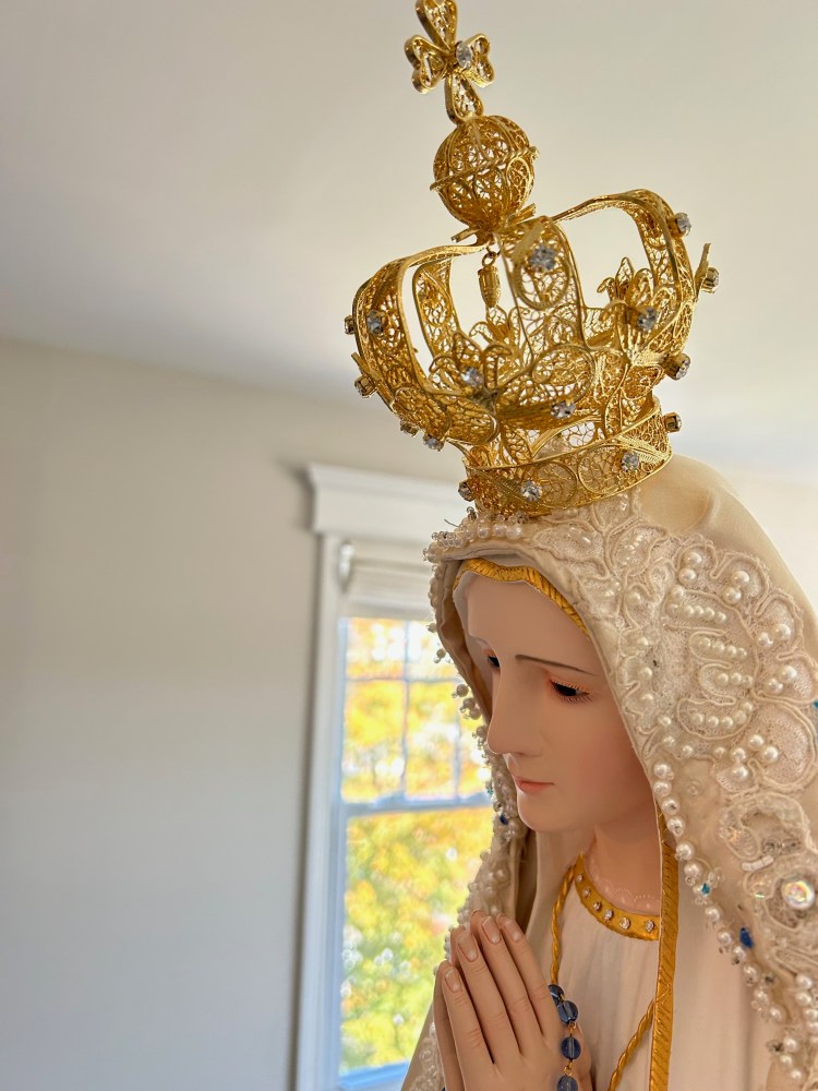 OUR LADY OF FATIMA MOTHER OF MERCY STATUEDuring the Summer of 2023, this one of a kind statue of Our Lady of Fatima, was hand-carved from a solid piece of wood by a noted carver in Fatima, Portugal. He artistically based its image details, and delicate hand-painting on original icons of Pilgrim statues of Our Lady from the late 1940s. It was commissioned by a small team, now referred to as “Shepherds” from Rhode Island, Connecticut, Massachusetts, New Hampshire, New York, Texas, and Florida.